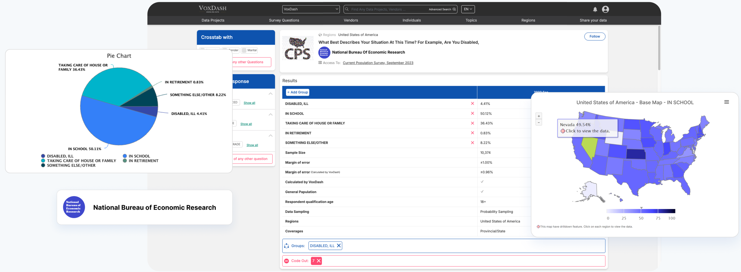 VoxDash™ enables polling firms, researchers, and institutions to upload, analyze, and responsibly license survey data, while maintaining full control over access, visibility, and usage terms. Designed as both a civic data repository and a metadata-rich utility, it offers AI-powered features such as multilingual translation, automated response coding, sentiment analysis, and per-question access for public datasets.